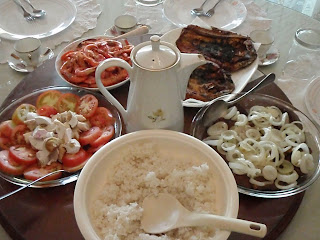 The traditional Filipino breakfast consists of plenty of rice, bangus (Milkfish), shrimp (served cold), filipino steak, champorado (hot chocalate), Tomatoes and eggs ( I know there's a name I just don't know it), puto and cheese ( puto is a rice cake)